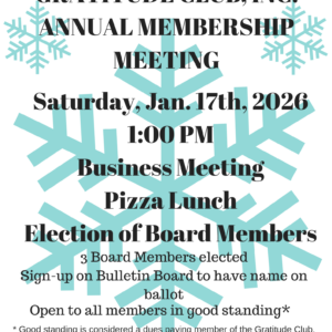 Annual Election of Board Members Saturday, January 17th at 1 PM. If you would like to be considered for a Board member position ( 3 year term) please sign up on the Bulletin Board at the Gratitude club by Friday, January 16th to be placed on the ballot. You may be nominated from the floor...