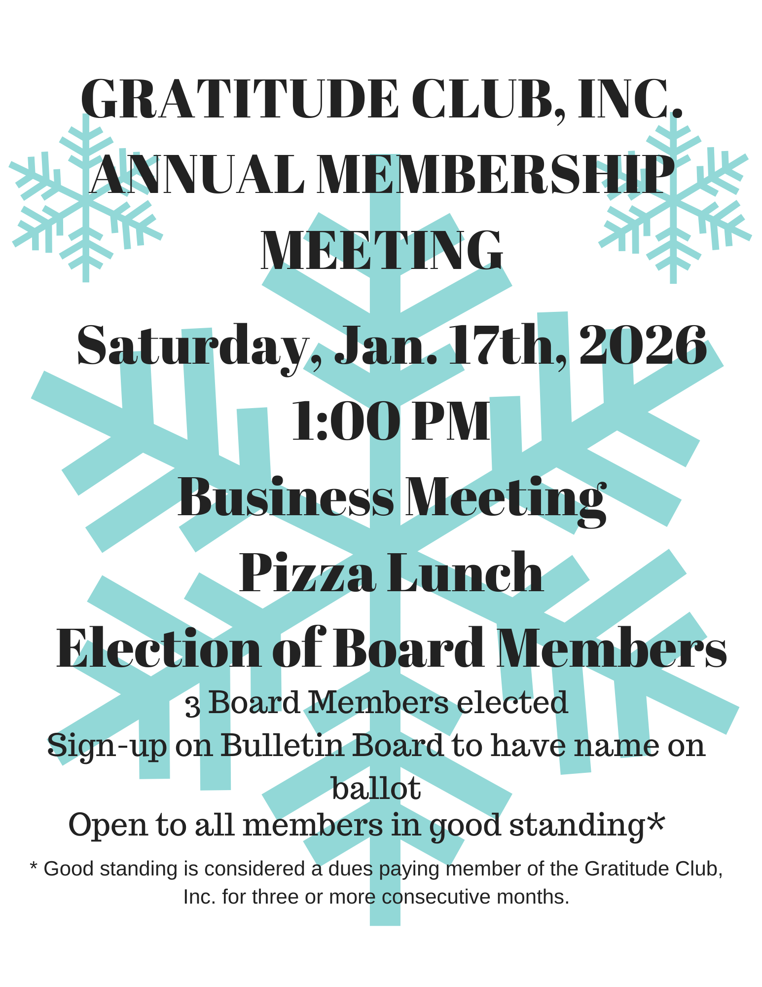 Annual Election of Board Members Saturday, January 17th at 1 PM. If you would like to be considered for a Board member position ( 3 year term) please sign up on the Bulletin Board at the Gratitude club by Friday, January 16th to be placed on the ballot. You may be nominated from the floor the day of the meeting. 3 positions are open and available to both members and non-members currently.