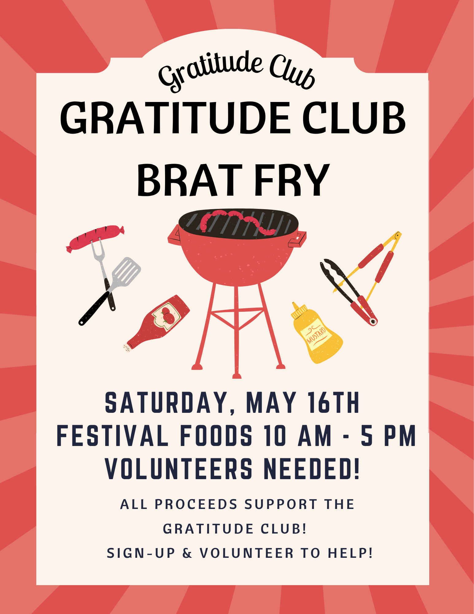 The Gratitude Club is hosting a Brat Fry at Festival Foods on May 16th from 10 AM – 5 PM!