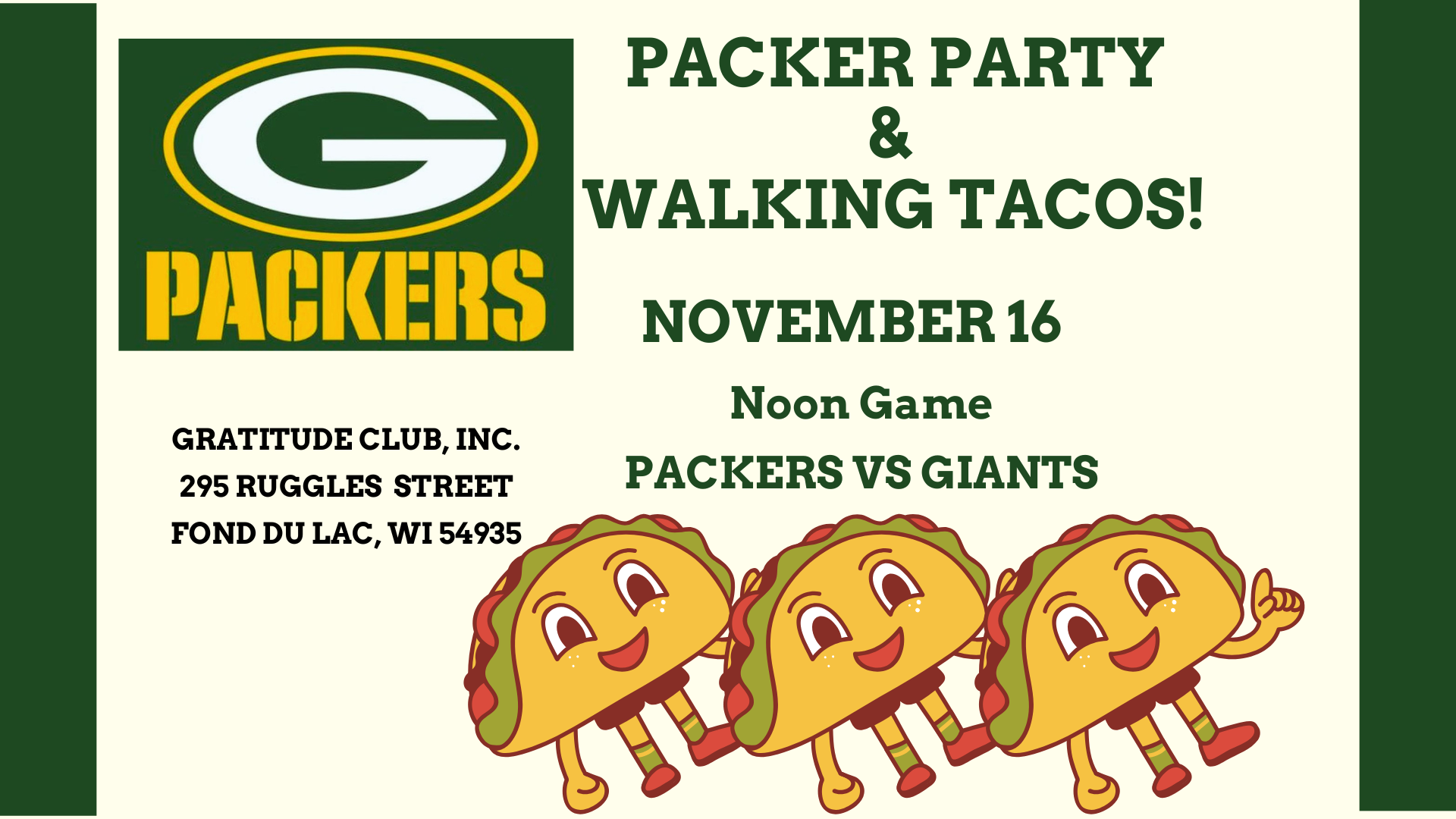 The Packer Party on November 16th will have a Mexican flair with our all-time favorites, the walking tacos, being served! Walking tacos will be provided but bring along your special chips, dips or salsa’s or desserts to share if you can!